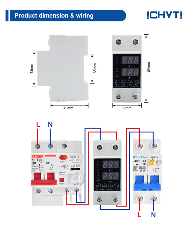 ICHYTI digitalna napetostna zaščita Mere in ožičenje