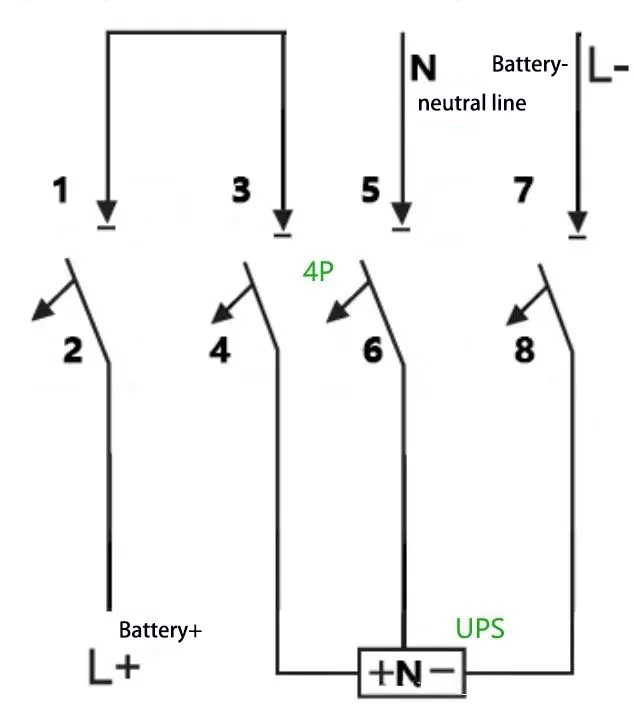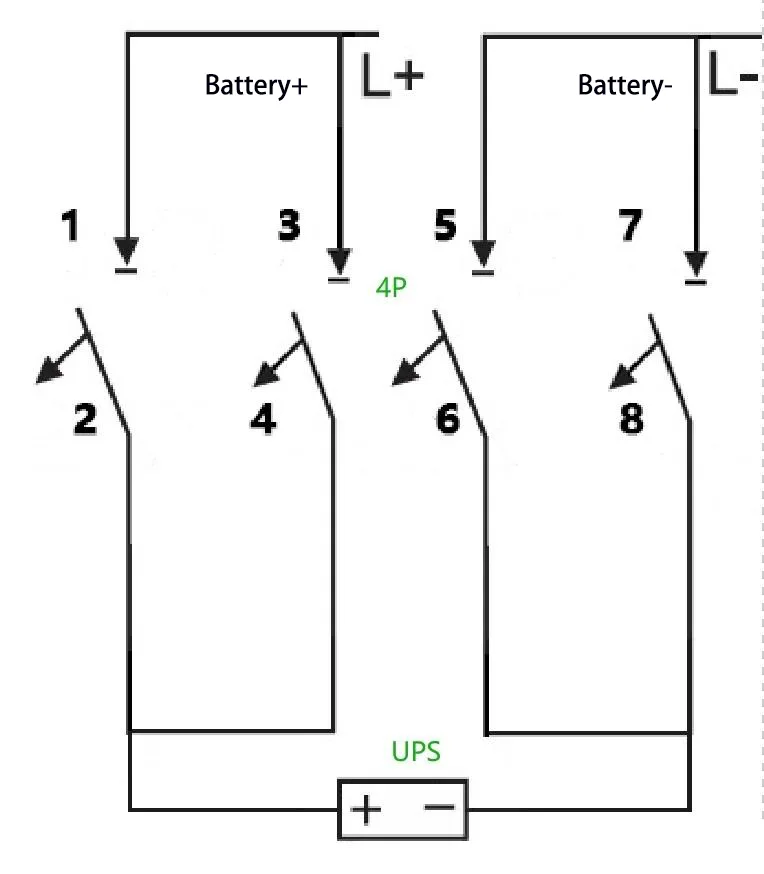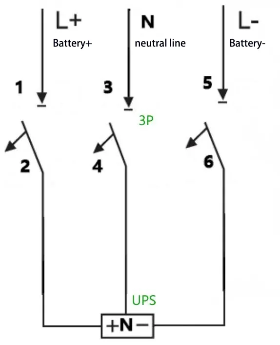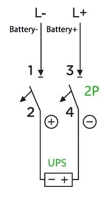 C:Na primer: za UPS z zmogljivostjo 40 kVA in nazivnim baterijskim nizom 40 celic (napetost izenačevalnega polnjenja: 14 V × 40 = 560 V) je največji delovni tok izračunan kot 40 kVA × 1,0 ÷ 90 % ÷ 10 V ÷ 40 = 111 A. Lahko se uporabi 3P 750 V 150 A odklopnik, z dvema zaporedno povezanima poloma. Način ožičenja je naslednji: